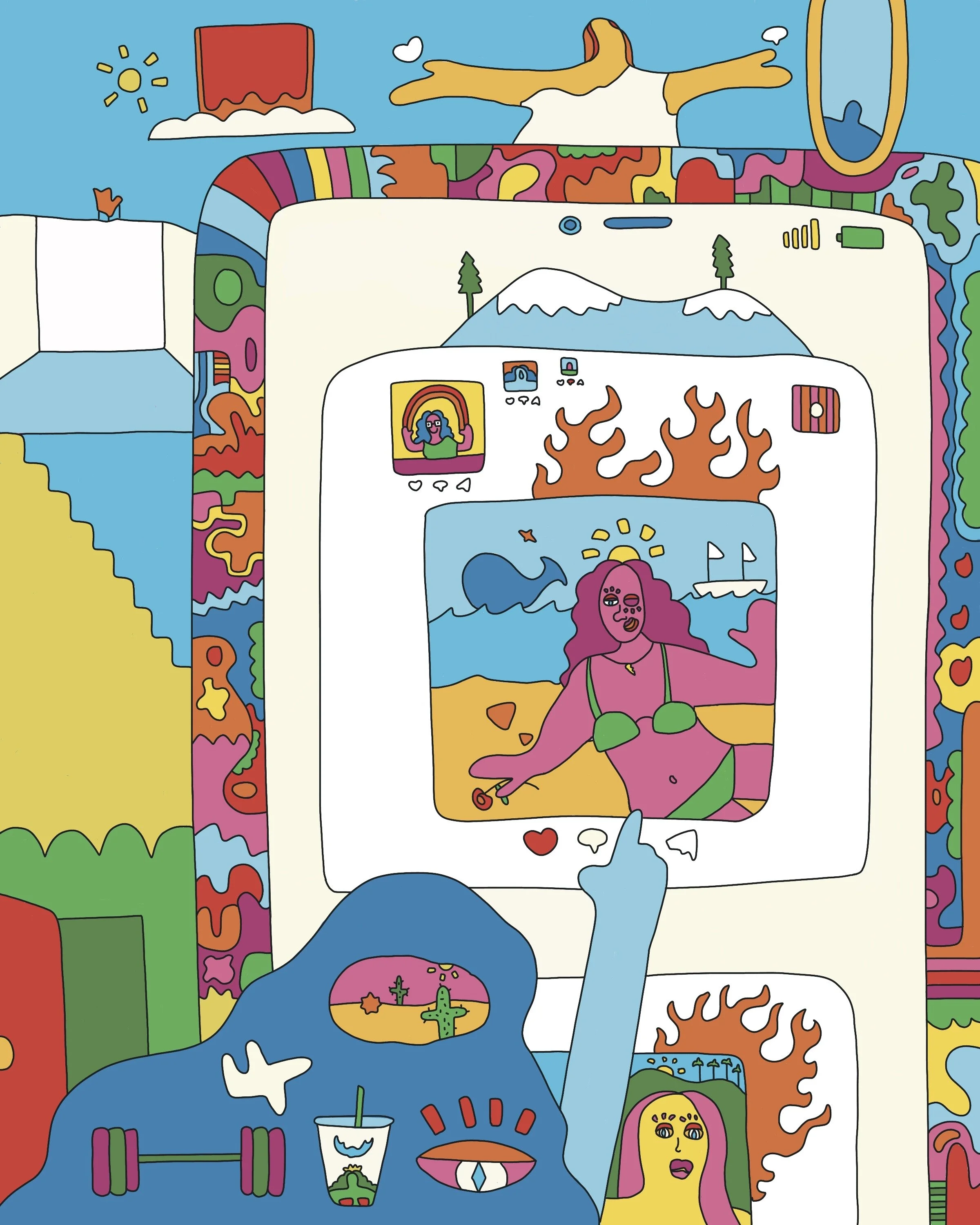 Artwork that acts as a social commentary in response to the way people love and show love to one another using networking platforms. The work visualizes a larger-than-life electronic device being used for social media by a figure with a perspective from behind. The way we watch one another for cues, trends and inspiration becomes the jumping-off point for what is cool and who will be celebrated because of it. The largest figures are symbolic of those who accrue this popularity the most, indicative with interactive like, comment and share icons that also place a certain content’s importance in the scene. Social media is grand and assuming, it is a spectacle, the handbook for what to consume and how to speak, a bible for those who seek its solace. We devote ourselves and pine and pace over the pace and pressures to be someone worthy of praise so much so we become nobody at all. The top of the image represents this sentiment paired with the notion that social media users devote themselves to something that makes us more unknown and absent. It interrupts our life like the fall of a curtain amid a show we were not even watching.